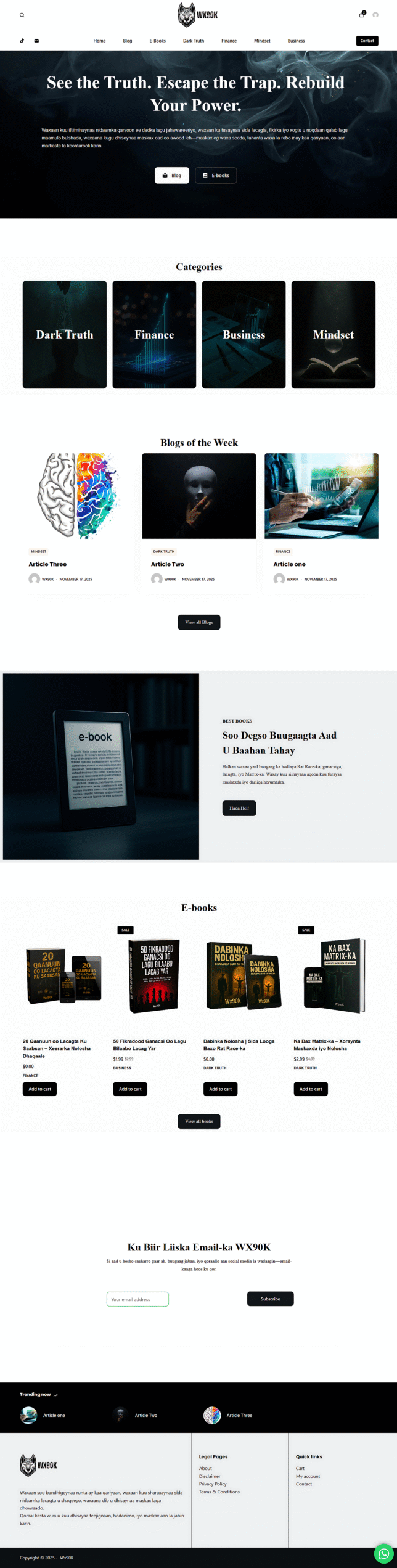 WX90K needed a modern platform to host educational blog content and sell digital e-books related to finance, personal development, and lifestyle. The goal was to create a clean, easy-to-navigate system that supports both content consumption and digital product sales.